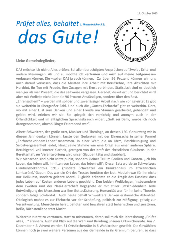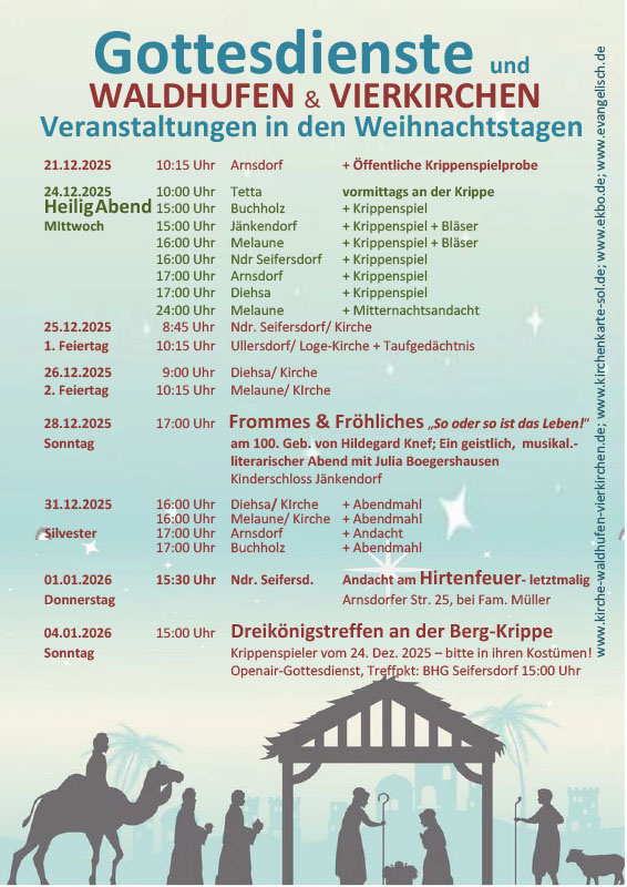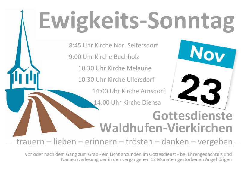 Seit 1. Januar 2023 bilden die 6 Kirchengemeinden in Waldhufen und Vierkirchen die „Gesamtkirchengemeinde Waldhufen-Vierkirchen“. Eine gemeinsame Geschichte von 8 Jahren als Pfarrsprengel ist diesem notwendigen Schritt voraus gegangen. Eintausendsiebenhundert Gemeindeglieder gestalten zusammen mit einer Pfarrperson das Gemeindeleben mit 8 Kirchengebäuden